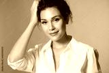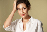 Pretty young woman with perfect glowing moisturized skin looking at camera, touching head, smiling. Stylish caucasian female model posing on natural olive background. Girl beauty and skincare concept.