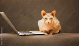 A serious bald cat works on laptop sitting on a gray couch. A concept of working remotely from home, domestic animal interaction with technology. Leather cat breed Canadian Sphynx, sphinx feline pet.