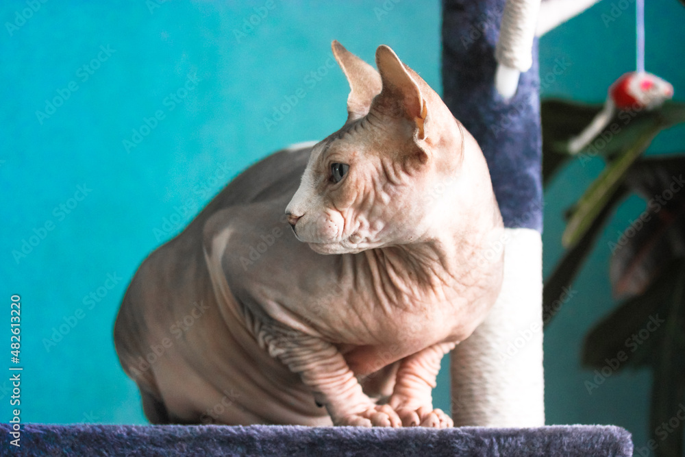 Adorable Canadian Sphynx cat is sitting on a claw tower, scratching post against blue wall indoors. Pet in a modern home interior. Unusual breed cat with blue eyes, white muzzle. A toy for cute cats.