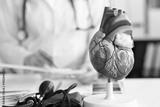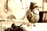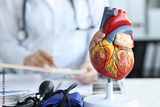 Artificial plastic model of human heart standing against background of cardiologist closeup