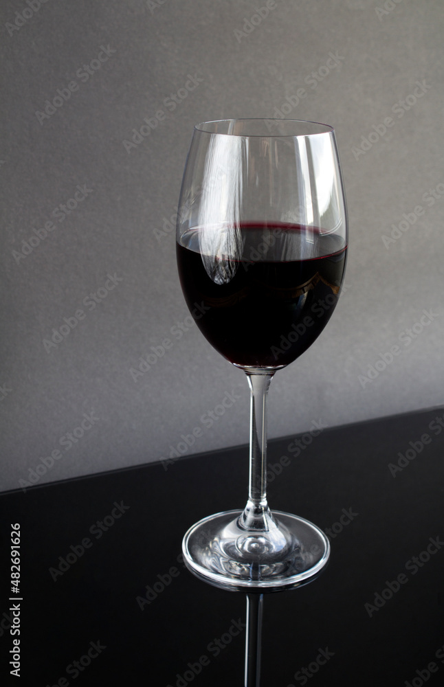 Wineglass with red wine on the dark background. Close-up. Location vertical.