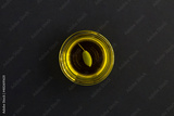 Top view of olive oil in a glass bowl on the black background. Copy space.