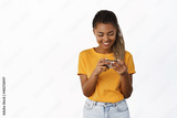 Happy black girl smiling and playing mobile video game, using application, watching videos on smartphone, standing over white background