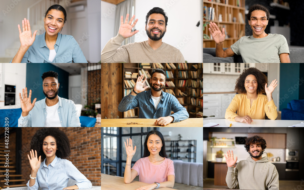 Online conference, video chat of diverse people. Video screen with a group of multiracial employees, brainstorm online, crowded screensaver of many people talking online, taking a part in webinar