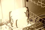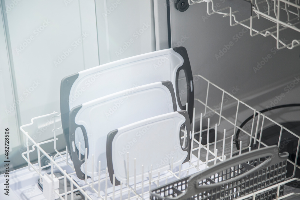 Plastic cutting boards in dishwasher in kitchen