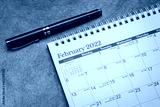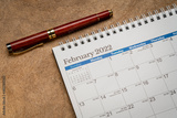 February 2022 - spiral desktop calendar against textured bark paper with a stylish pen, time and business concept