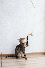 Bengal kitten plays with a feather near a white wall