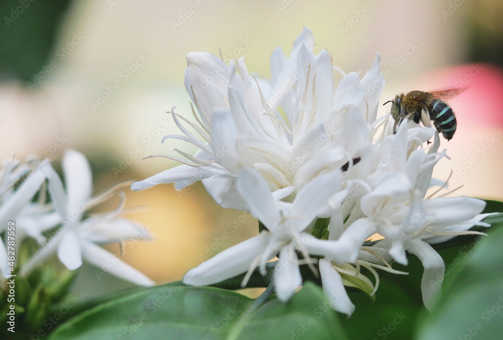 Blue Banded Bee ( Amegilla cingulata ) fliing to seeking nectar in Robusta coffee blossom on tree plant with green leaf. Petals and white stamens of blooming flowers, Blue and black stripes on insect