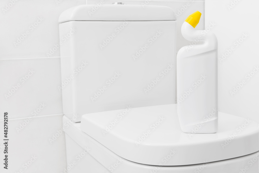 Toilet cleaner bottle mockup for design on white lavatory pan