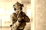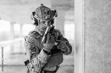 Special forces operator wearing Multicam uniform and his handgun xdm 9mm while practicing CQB combat training in the abandoned building. Coyote brown and mc gear with gun in the urban environment.
