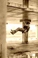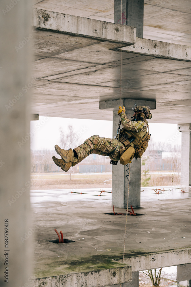 Special forces operator rappeling down the abandoned building on the rope. Multicam camo with coyote brown addons.