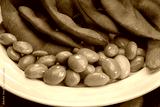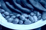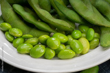 Green Edamame in white plate on wooden background, Steamed edamame sprinkled with sea salt on rustic black wooden table.