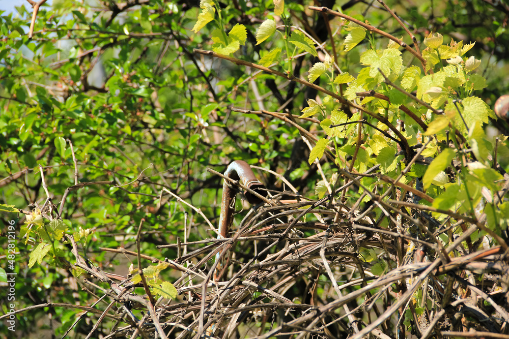 Fresh green leaves on vines in vineyard in spring in sunlight close-up