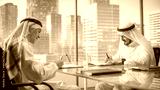 Two Happy Emirati Businessmen in White Traditional Kandura Sitting in Office and Signing Contract. Business Partners Sign Lucrative Investment. Saudi, Emirati, Arab Businessman Concept.