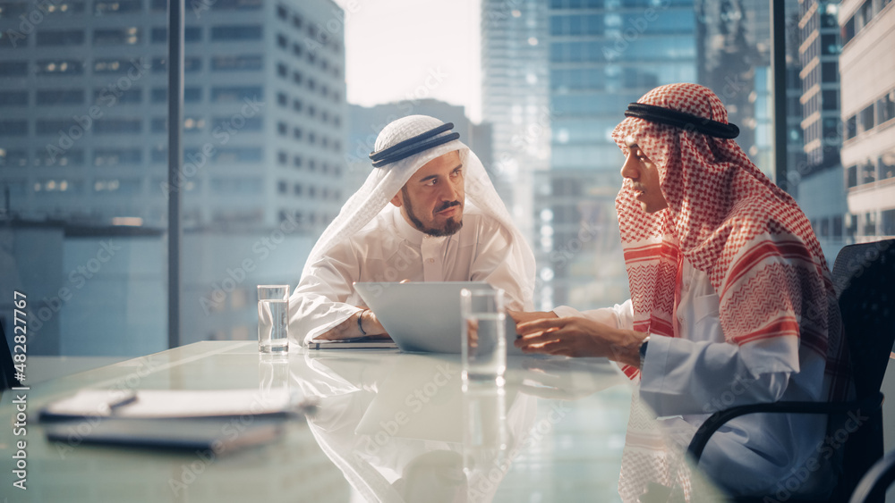 Two Successful Emirati Businessmen in White Traditional Kandura Sitting in Office Meeting, Negotiating and Talking About Investment Opportunities Using Laptop. Saudi, Emirati, Arab Businessman Concept
