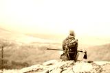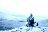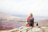 Hiker girl taking a rest on a rock in the mountains. Windy day. Travel and healthy lifestyle outdoors in fall season
