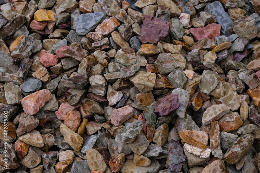 Decorative colored gravel in the rain. Natural stones for design in Germany.