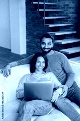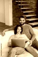 Young Pakistani couple using laptop while sitting on the sofa at home. Spouses watching movie on laptop. Happy man and woman embracing while looking at the camera