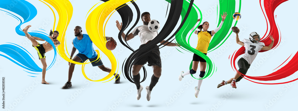 Set of professional sportsmen in action isolated on white background with blue, yellow, black, green and red stripes, lines.