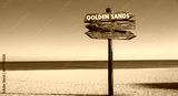 Wegweiser am Sandstrand am Goldstrand an der Bulgarische Schwarzmeerküste