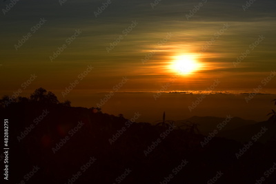 sunrisie or sun setting behind a dense forest area followed by mountains