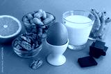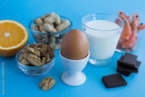 Close-up on food allergens on the blue background. Copy space. Food allergy concept.