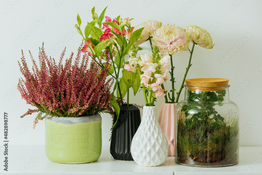 Flowers in small vases. Various small flowers to decorate your home in spring