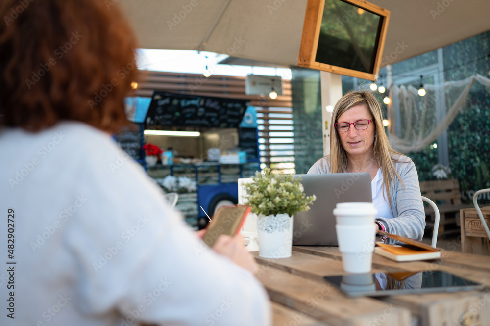 middle-aged woman with laptop, meeting a female customer in a coffee shop