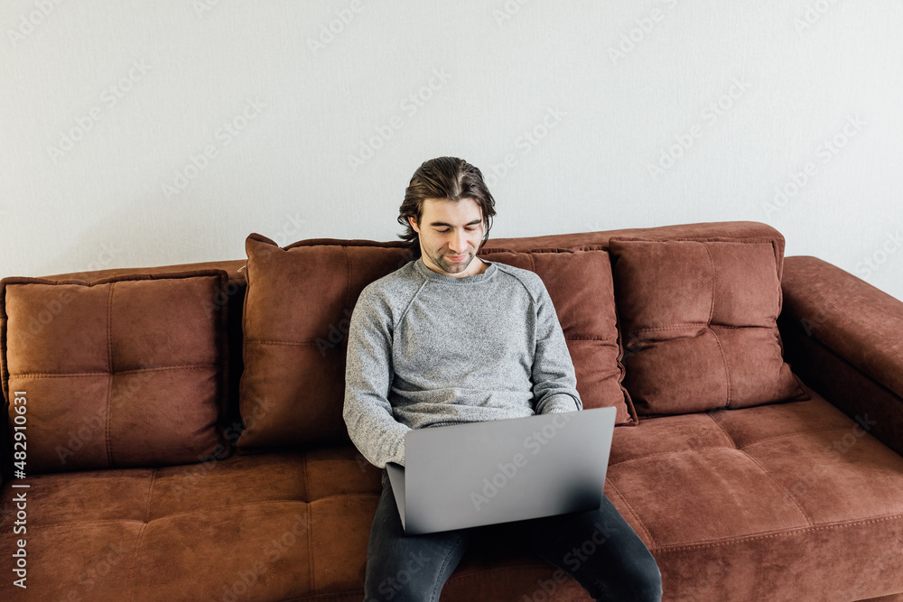 handsome boy student professional employee typing on laptop sit at home on sofa, caucasian man studying e learning online software using technology app and books for work education concept
