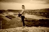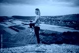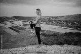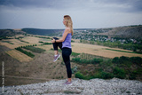 Young athletic woman in black sportswear does stretching exercises outdoor on the sky background. Sports lifestyle