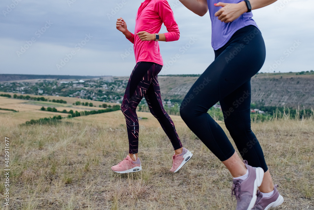 two Woman running the run on the field. Healthy young pretty woman jogging, doing sport outdoor, freedom, vacation, heathcare concept with copy space over natural sky background