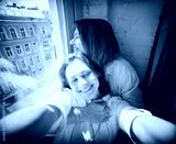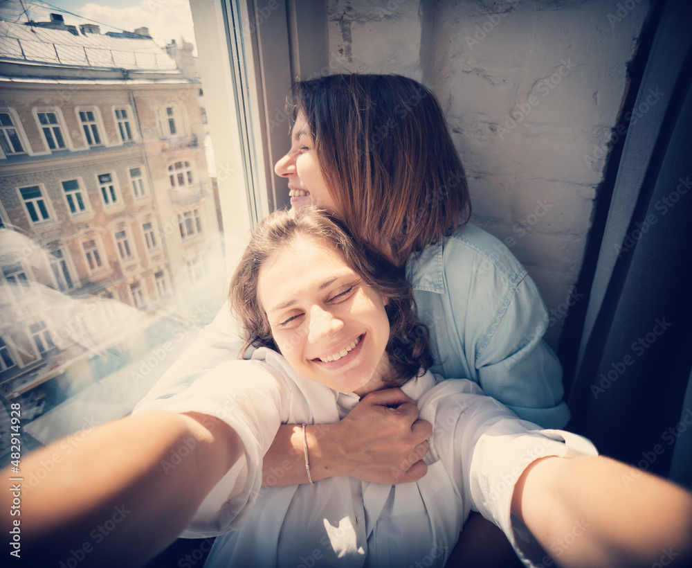 Young beautiful lesbian couple making selfie on smartphone while sitting on windowsill in street view apartment