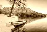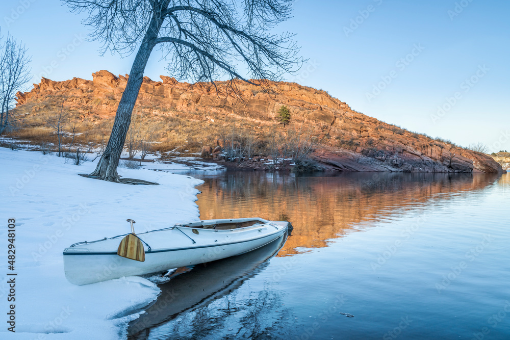 decked expedition canoe in winter scenery of Horsetooth Reservoir in northern Colorado