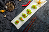 Fried shrimp in wasabi sause on dark stone table top view