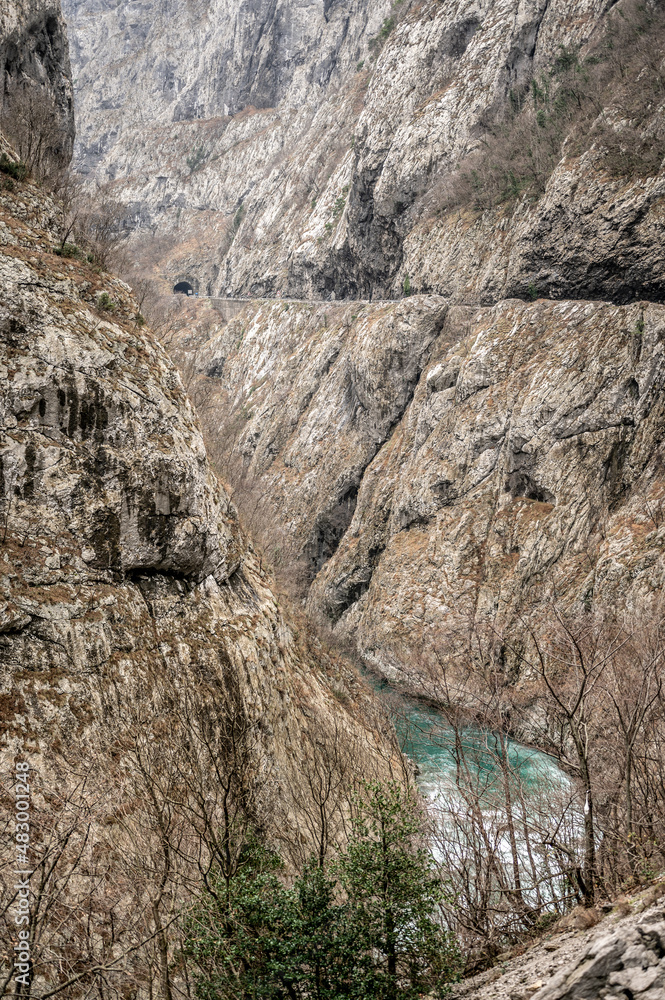 River Moraca, canyon Platije. montenegro, canyon, mountain road. Picturesque journey along roads of Montenegro among rocks and tunnels