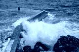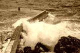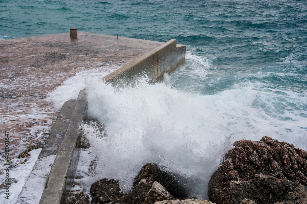 Big wave splash on pier. Big sea wave on a windy day. Waves crash against concrete breakwater at port entrance. Giant waves breaking on breakwater
