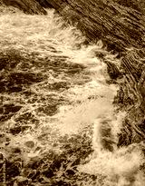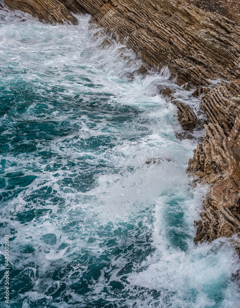 Dramatic marine background. Rocky coast of Adriatic Sea. White foamy waves beat against stone shore. Panorama of sea coast. Aerial top view.