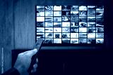 Video on demand service on smart TV. man choosing what to watch on TV at home. Video on demand or VOD. Online movie stream service in smart tv. Male hand holding TV remote control.