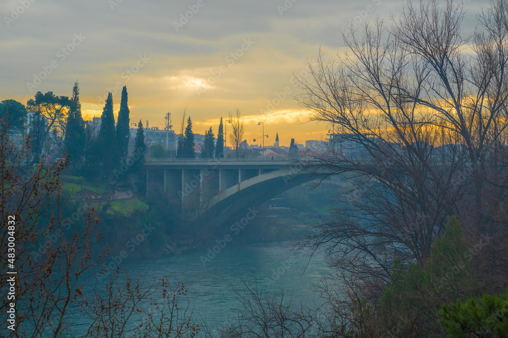 Blazo Jovanovic Bridge over the river Moraca in Podgorica, capital of Montenegro. evening, winter, sunset, dawn