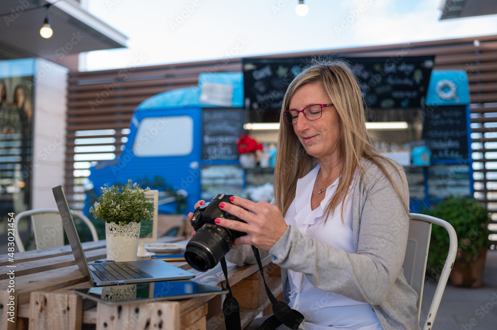 Woman reviewing photographs on a reflex camera in a coffee shop