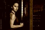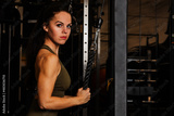 A beautiful woman in the gym exercises the triceps muscle on the pulley