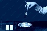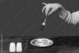 Human hand tasting bacon and eggs isolated on green and red background. Vintage, retro style interior. Food pop art photography.