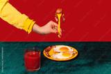 Human hand tasting bacon and eggs isolated on green and red background. Vintage, retro style interior. Food pop art photography.