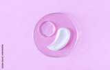 banner smear of cream round transparent drop of banner transparent gel serum in a petri dish on a pink background