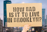 The question " How bad is it to live in Brooklyn? " on a banner in men's hand with blurred background. Danger. Dangerous. Outdoor. Street. Urban. Population. Overpopulation. NYC. New York