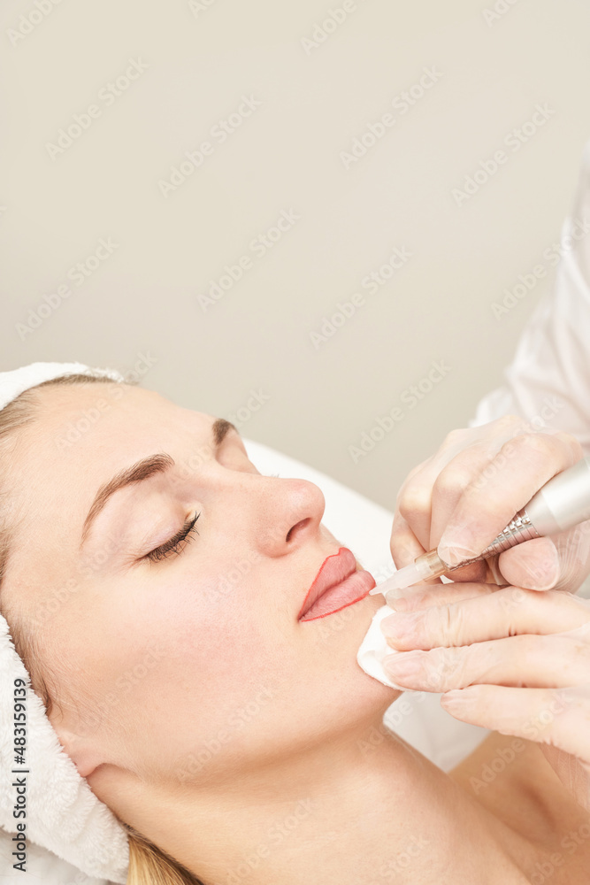 Permanent makeup. Beauty spa procedure. young woman. Face tattoo. Lip micropigmentation. Professional face microblading. Female cosmetology device. Copyspace. Mouth treatment. Dermatology