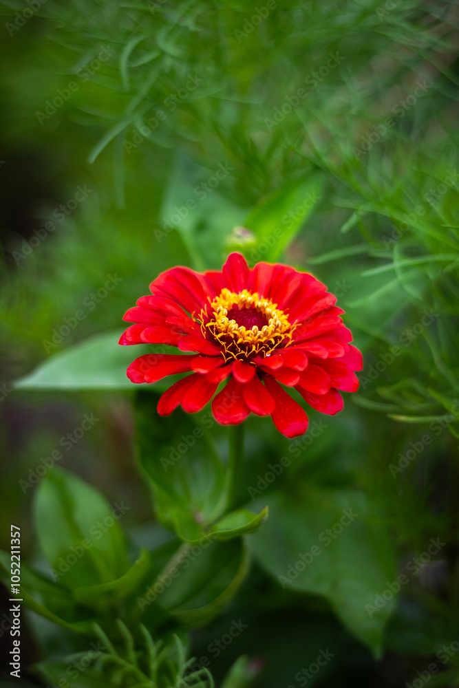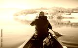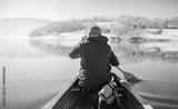 Rear view of man in red jacket paddling canoe on lake winter ride