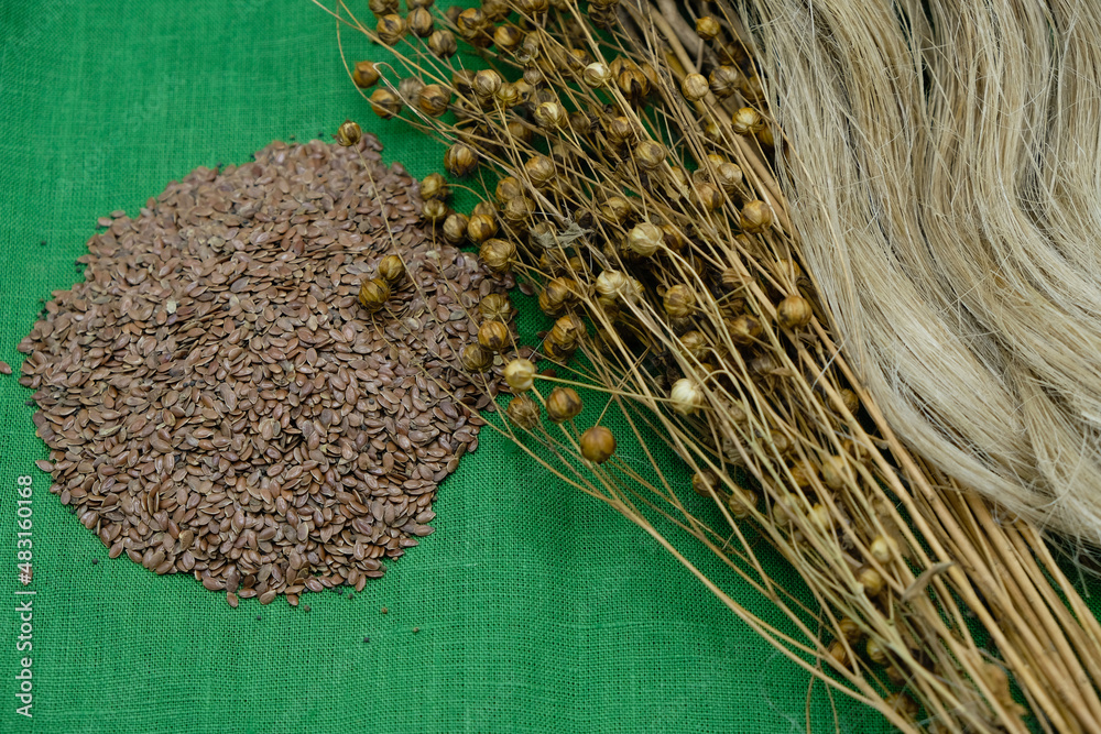 Flax seeds, pod seeds, and flax tow on a green linen canvas.