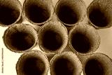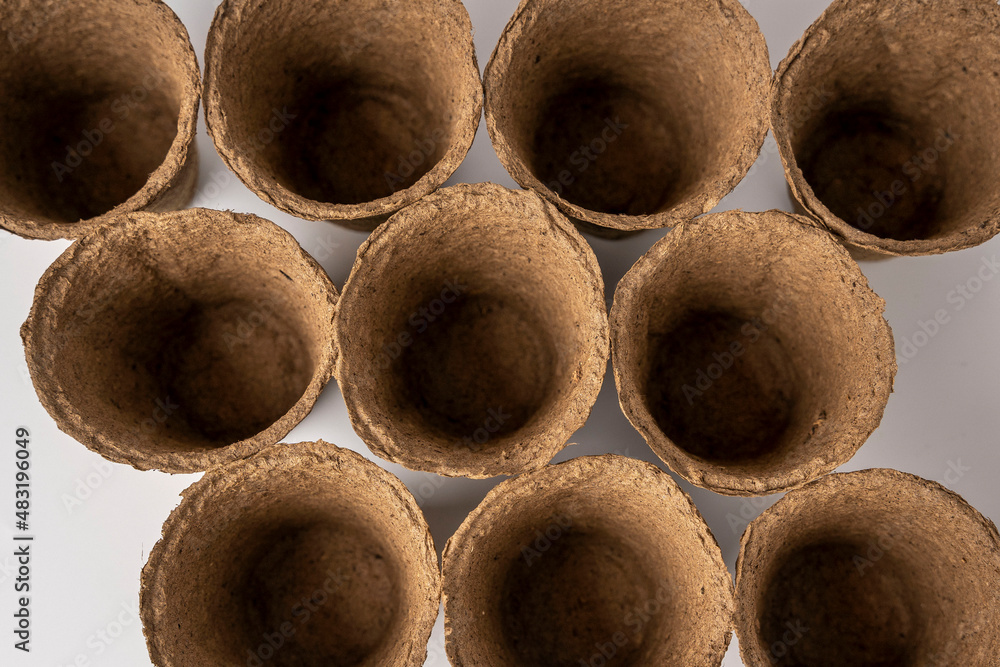 several empty peat pots for seedlings, standing in rows on a white background. top view