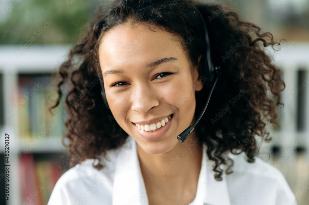 Close-up of successful pleasant curly woman, with headset, expert, consultant or call center operator, looks directly at camera, smile friendly. Support service concept, hotline, distant communication
